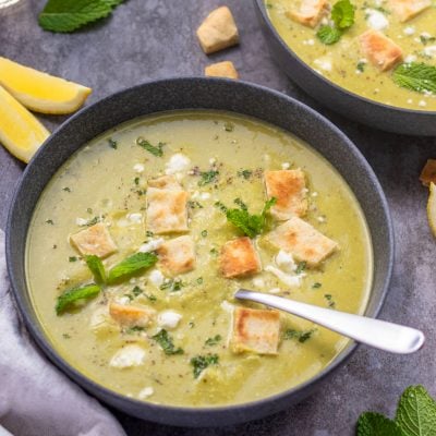 Isn’t it true that sometimes the best dishes are born from needing to use up what’s in the fridge or what’s growing in the garden? This spring soup came together just like that. I had a bunch of asparagus on my countertop, a bag of peas in my freezer, and mint practically taking over my backyard, so I thought, why not? To give it a Mediterranean twist, I added feta cheese and pita croutons, which add a tangy flavor and delicious crunch to every spoonful. The soup is great hot, but you’ve got to try it chilled—the leftovers are even better that way!