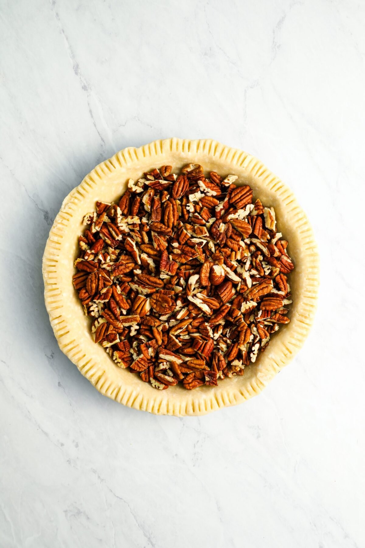 Step 3: Assemble the pie. Scatter the chopped pecans evenly over the bottom of the chilled crust, then pour the filling right over the top. If you saved a few whole pecan halves, nestle them on top in a little pattern—just press them in gently so they glaze over with the filling. Brush the edges of the crust with the beaten egg (or milk/cream), if using, and slide the pie onto the preheated baking sheet in the oven.