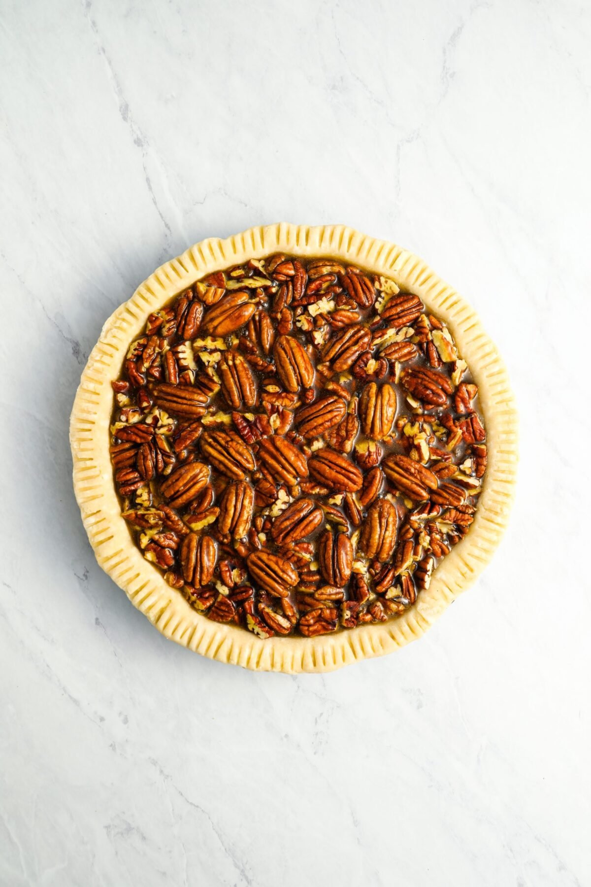 • Sprinkle the coarsely chopped pecans in the chilled pie crust, then pour the egg mixture evenly over the top. If you've set aside a few whole pecan halves, arrange them on top in a decorative pattern, pressing them slightly into the filling before letting them rise back up to ensure they're coated. Brush the edges of the pie crust with the beaten egg, milk, or cream. Place the pie on the preheated baking sheet in the oven. Bake until set and golden, 50 to 55 minutes. Remove the pie from the oven and let it cool on the baking sheet on a wire rack, about 4 hours. Serve at room temperature with whipped cream or vanilla ice cream.