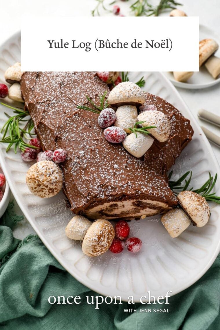 A yule log cake or Bûche de Noël is one of those holiday desserts that looks wildly impressive—and is genuinely fun to make. It starts with a light cocoa sponge rolled with a fluffy cream filling, then gets coated in whipped chocolate ganache that you frost into those classic bark-like lines. From there, the magic happens: crisp meringue mushrooms, sparkling sugared cranberries, and a snowfall of confectioners’ sugar that makes it look like it came straight out of a winter forest.